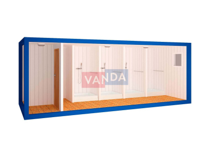 Для автономной работы душ-контейнер снабжается водонагревателем и водяным накопительным баком. Количество душевых кабинок зависит от пожеланий заказчика, но, как правило, их количество не превышает 3-5 штук.